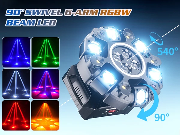 At the heart of its design is a unique dual lighting system. Six 90° swing arms with bright RGBW LEDs work in unison with four hexagonal-eye projectors, producing stunning honeycomb beam arrays that fill any space. The motorized head offers an extensive 540° horizontal rotation, enabling the creation of vast, dynamic light networks and complex patterns.
