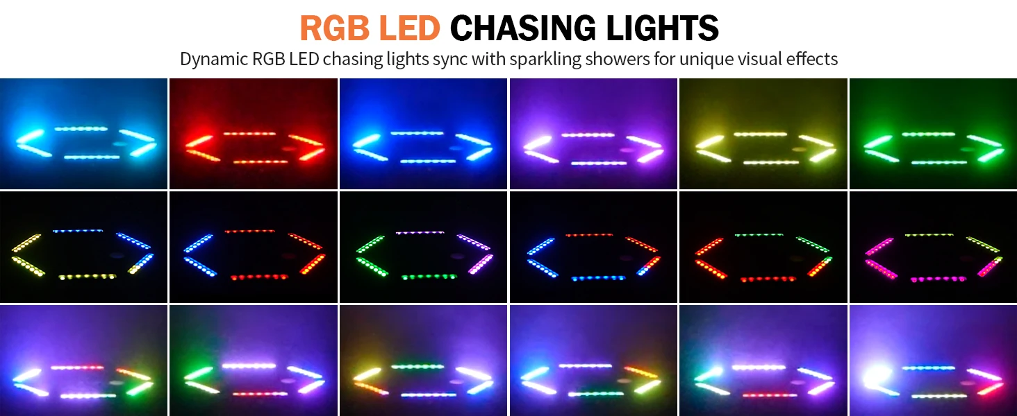 All-in-One Visual Appeal: Beyond sparks, the unique hexagonal housing is equipped with 6 dynamic RGB LED light strings that create a mesmerizing chase effect, adding an extra layer of visual excitement even when the sparks are off.