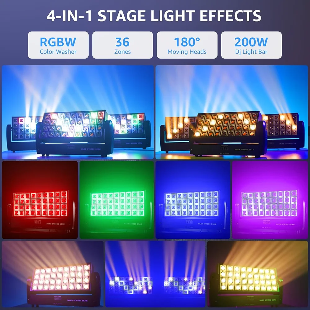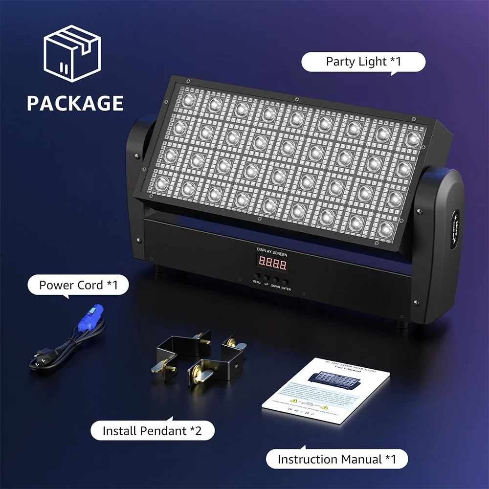 It features 36 high-power 3W warm white LEDs (3200K) for a blinding strobe and wash effect, segmented into 36 customizable sections. Complementing this are 648 auxiliary 5050 RGB LEDs, also split into 36 segments, allowing for stunning color mixing, dynamic chases, and background effects.