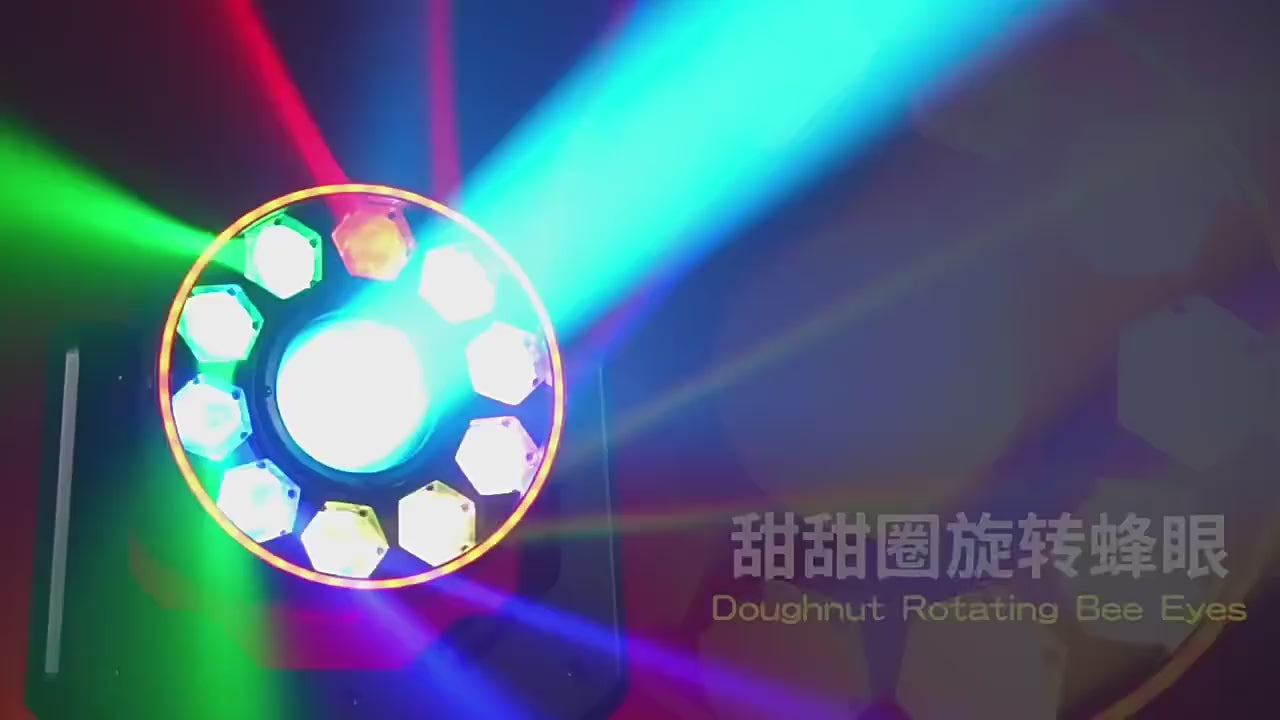 The KW4 10x20W Donut Bee Eyes Moving Head Wash is an innovative, multi-functional fixture designed to elevate stage visuals with precision and flair. Featuring ten powerful 20W RGBW LEDs and a wide 100mm beam aperture, this unit seamlessly combines sharp beam effects, vibrant washes, and the signature "Bee Eye" rotation. An integrated auxiliary LED strip further enhances the "donut" aesthetic, providing layers of creative depth.